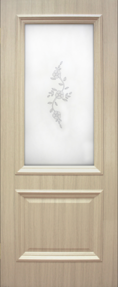 Полотно рамочной конструкции, изготовленное с применением натуральной древесины, древесноволокнистых плит высокой плотности (ХДФ), декоративной пленки ПВХ. Дверное полотно состоит из: 1. Каркаса (сращенный брус хвойных пород древесины). 2. Филенки (плита МДФ 16мм) 3. Стекло (сатин 4мм с нанесением фото печати «цветы кофе») 4. Багетная рамка (плита МДФ ламинированная декоративной пленкой ПВХ) 5. Облицовки каркаса – «скин» (плита ХДФ 3мм ламинированная декоративной пленкой ПВХ)