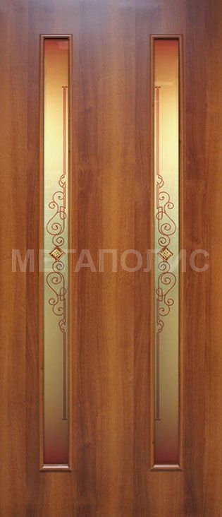 Предлагаем вам межкомнатную ламинированную дверь «Вероника 2 ФП» с двумя продольными вставками в виде двух матовых стекол с цветочным узором. Конструкция данной модели состоит из каркаса, который собирается из скрепленных между собой сосновых брусьев, внутреннего наполнителя в виде сот из картона. И внешнего покрытия, которым является плиты ХДФ. Эта плита дополнительно покрыта финиш-пленкой, которая продлит срок эксплуатации двери. Модель «Вероника 2 ФП» изготавливается из экологически чистых материалов.